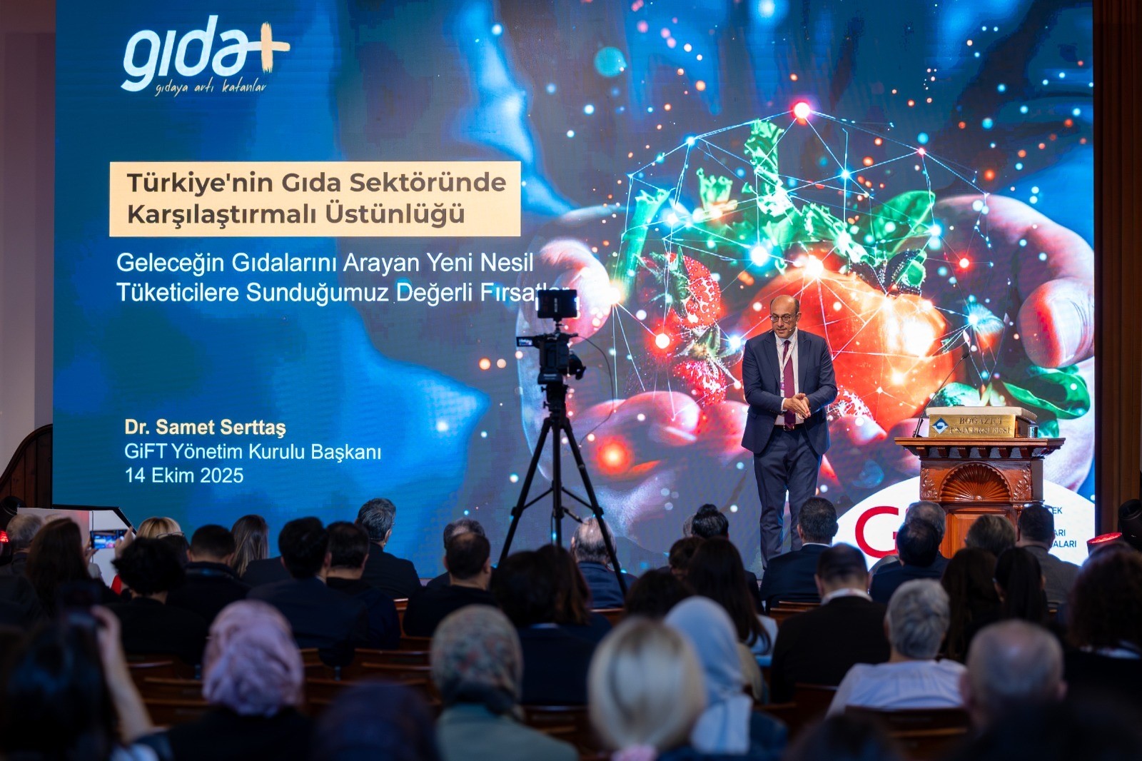 GiFT Yönetim Kurulu Başkanı Dr. Samet Serttaş, zirvede yaptığı konuşmada, "Geleceğin gıdalarını arayan yeni nesil tüketicilere sunulan fırsatlar giderek önem kazanıyor. Bu nedenle açlık ve yeterli beslenme odaklı stratejiler yerine, besleyici, sağlıklı ve katma değerli gıdaya odaklanmamız gerekiyor. Dünyada 2,6 milyar insan sağlıklı diyete erişemiyor ve tarım ile gıda tedarik zincirinde değerin yüzde 73-93'ü çiftlikten sonra üretiliyor. Özellikle ABD pazarında, tüketicilerin üçte ikisi gıda satın alırken sağlığı en önemli kriter olarak dikkate alıyor. Bu bağlamda 2030 hedeflerimiz; gıda ihracatını 60 milyar dolara çıkarmak, işlenmiş ürün oranını yüzde 70 seviyesine ulaştırmak ve Global Top 100'de 5 Türk markasının yer almasını sağlamak" ifadelerini kullandı.